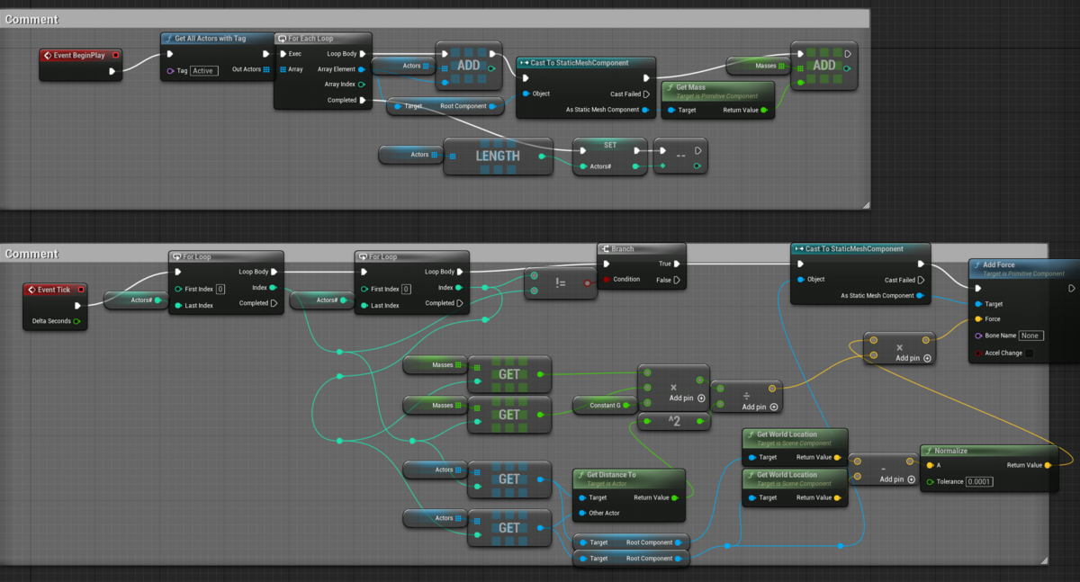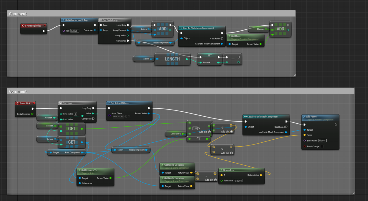 参考の一つ目の動画では複数の天体の多対多の万有引力を実装している。多対多の万有引力のBluePrintは下のようになる。球体同士が衝突して一体となると回転し始める癖がある。