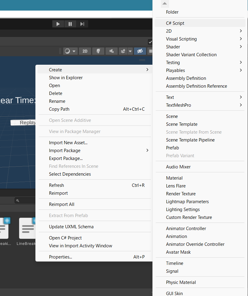 - 画面下のプロジェクトタブ上で左クリックするなどしてCreate>C# ScriptでC#コードを作成する。名前はGameManagerにする。
