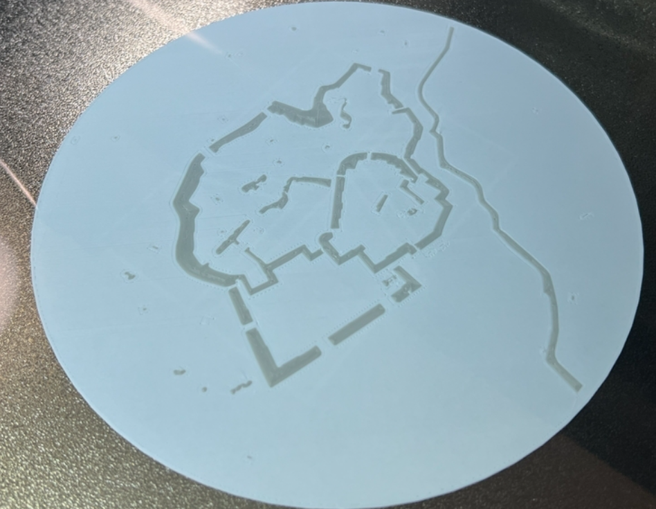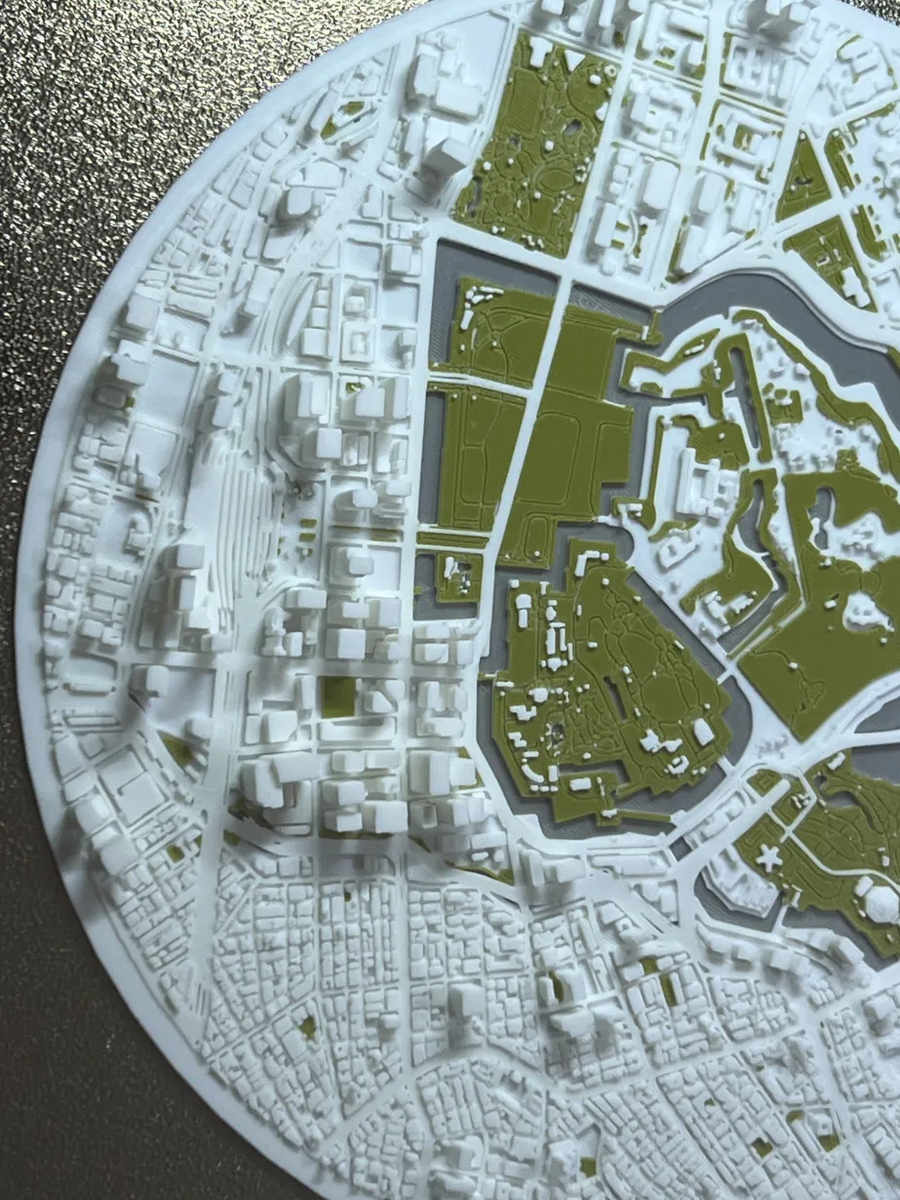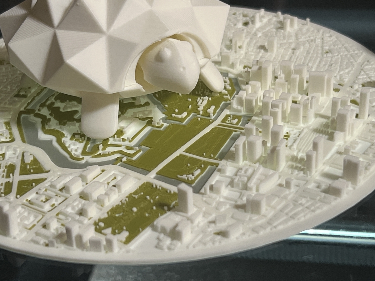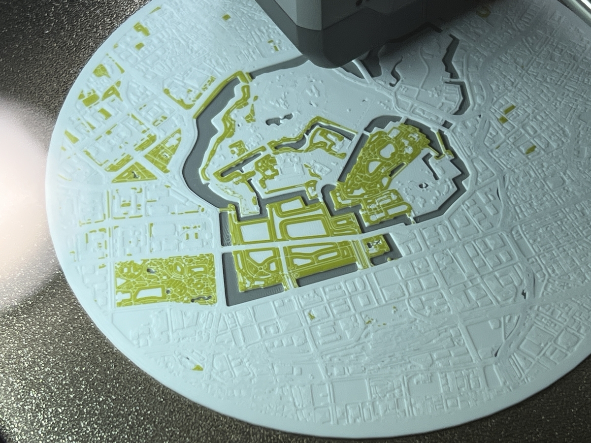 しばらくするとお濠が白のフィラメントで覆われた、フィラメント切り替えミス?と思ったが首都高がお濠の上を通っているためだと気づいた。都市の解剖学的構造を印刷を眺めながら楽しむ、贅沢だ。P2Sは上がガラス板なのでAMS2を動かすと上からじっくり眺めたり写真が撮れる。